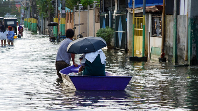 Balagtas, Philippines - 2025: People wade and use a small boat on a flooded street after downpour from Typhoon Uwan (Fung-wong). Photo: Cherish Gonzales, Shutterstock
